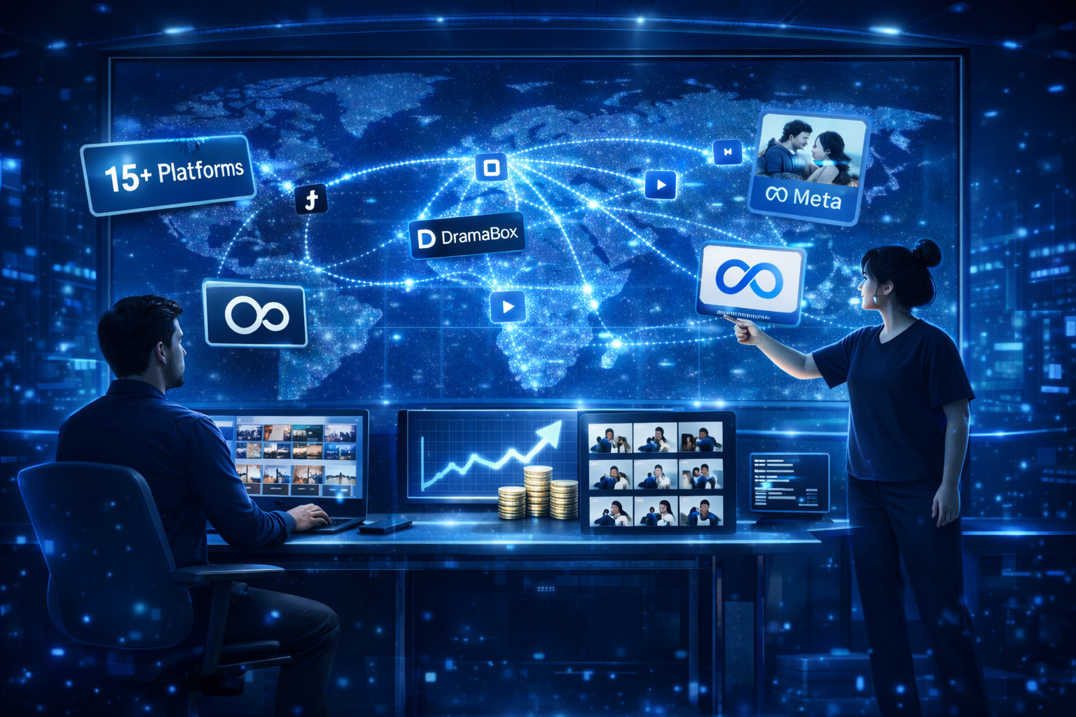 15+ short-drama platforms plus TikTok, YouTube, Facebook, Instagram — worldwide coverage.